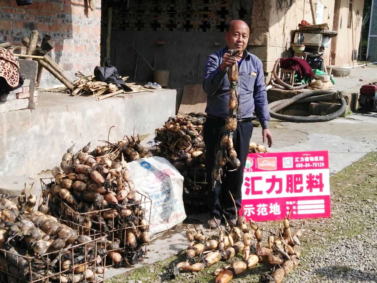 在3月26日,匯農新創生物科技有限公司工作人員來到在巴中市現代農業有限公司在柳林鎮罐子溝村的蓮藕基地。在忙碌的藕田基地,該公司技術負責人程大哥正在熱火朝天的指揮著收藕的師傅們。據程老師介紹,今年他年紀將近70歲,在公司主要負責蓮藕的種植以及田間管理,雖說自己不怎么干重體力活,但是操心的事情卻是很多,因是管理一萬多畝的蓮藕,種植品種為:鄂蓮七號,感覺自己責任很大,最擔心的就是蓮藕的收成不好,當看到一筐筐蓮藕從水田里面抬出來時,他感嘆道心里懸著的石頭終于落地。隨即我們對蓮藕進行數據測試,看著一根根胖胖的蓮藕,從筐里拿出一根在手里感覺很沉,不由的感嘆:重!后在電子稱上測出單根重量4.4KG,單框重量92KG......測出畝產量在達5000多斤,對于這個產量程老師很是滿意。在田間我們還清楚可以看見四川匯農新創生物科技有限公司為蓮藕定制專用肥口袋,程老師激動的說道:就是這個肥料,我們基地去年就是用的這個肥料,今天看到產量非常不錯。