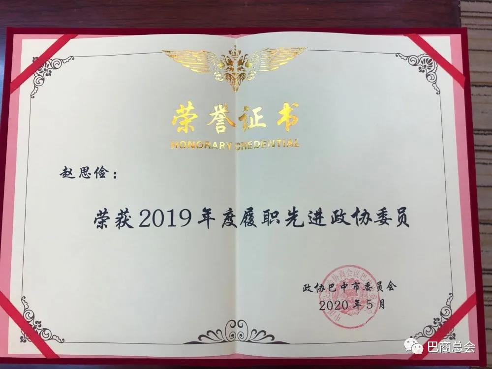 巴商總會會長趙思儉當(dāng)選為政協(xié)巴中市第四屆委員會常務(wù)委員,并榮獲2019年先進(jìn)政協(xié)委員。