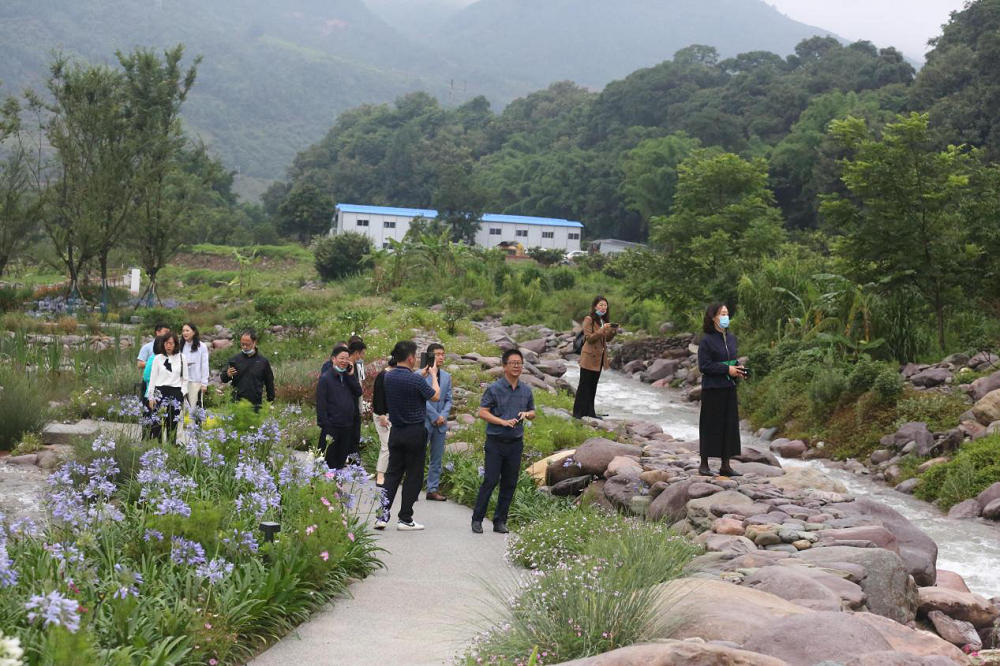 走進海花溝大地公園,在這海天一色的美景下,滿園的花繁草茂,公園里溪流旋轉,叮咚作響,時刻沖擊人們的視覺與聽覺。期間李總向客人們介紹了海花溝項目之前的地勢地貌及原有的景觀特色。